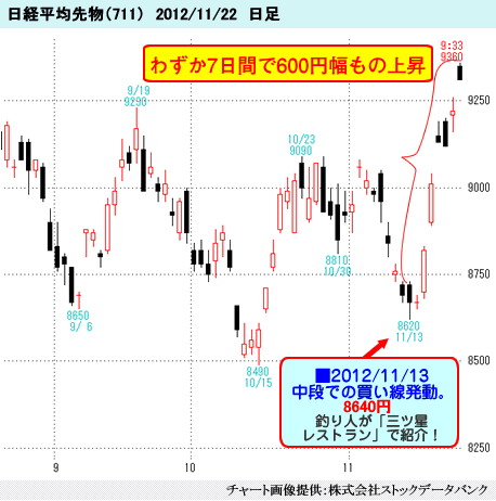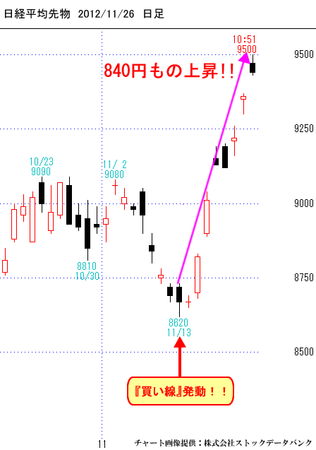 日経平均先物も同じようなチャートです。一段下げ、二段下げ、三段下げの思考があると11月21日は三段下げの最終の寄付きだと言うことがわかります。しかも、その日は日経平均先物、三空の投げの寄り付きでした。これを買わない手はないだろうという見方です。