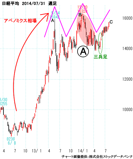 6/14の日足での三段下げそして現在の株価を並べました。先週末の英国国民投票がおわり、振り返ってみると現在のところ想像の範囲内での動きとなっています。週足チャートでのW底と果たしてなるのかどうか?