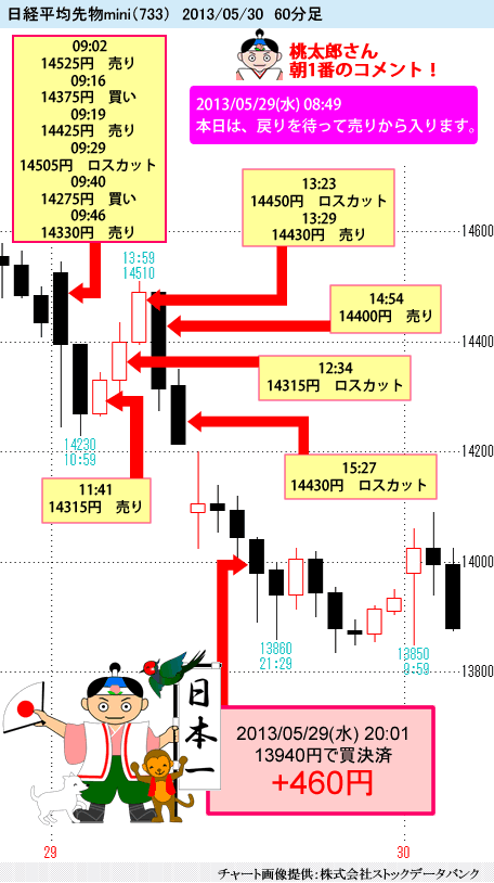 始めの商いは買いで入り負け、その後即座に売りだと判断し、売りに転じて何とか取れました。